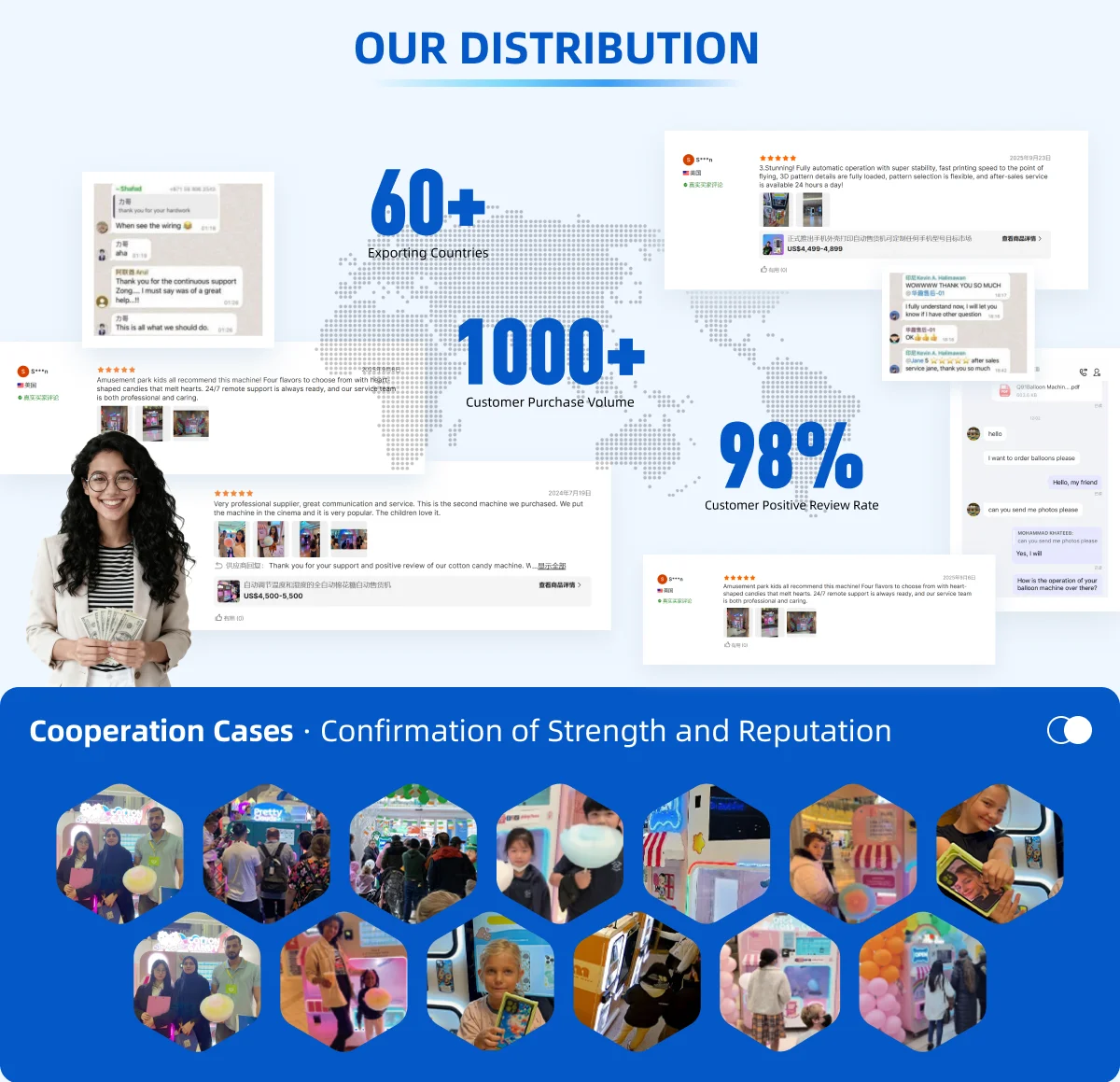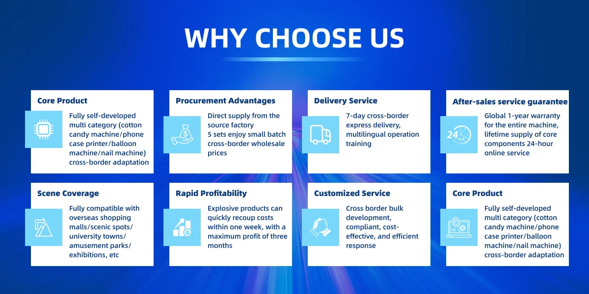 Productos principales:Máquina de impresión de Fundas para teléfonos, máquina de globos, mini máquina de algodón de azúcar, máquina de algodón de azúcar, máquina expendedora completamente automática